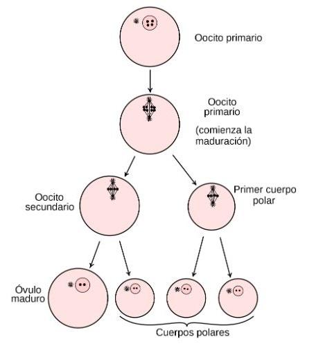 En cada ciclo ovárico, los ovocitos maduran. Específicamente, el ovocito presente en el folículo maduro (en este punto la carga genética aún es diploide) reanuda los procesos de división celular y culmina con la formación de dos estructuras denominadas ovocito II, con carga genética haploide y un corpúsculo polar.