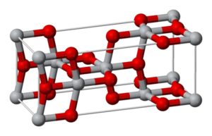 Estructura cristalina del rutilo. Bolas grises: titanio, bolas rojas: oxígeno. Fuente: Solid State CC BY-SA 3.0, Wikipedia Commons