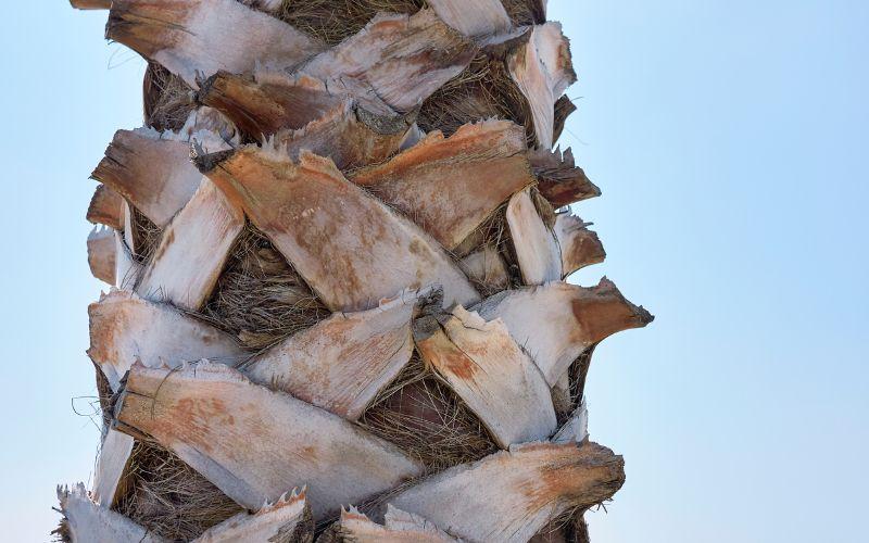 - Tallo. El tallo presenta un diámetro promedio de 1 metro y la corona es una roseta que contiene grandes hojas palmeadas. Además, el tallo es columnar y está cubierto por hojas muertas denominadas pelusas, o falda en su conjunto. Las faldas de las hojas viejas persisten por años, a menos que sean podadas o liberadas por el viento o el fuego. Cuando esto sucede, la base foliar permanece y forma un atractivo tejido de cesta en casi toda la longitud del tallo.