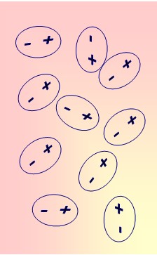 Un dipolo es eléctricamente neutro, pero la carga positiva está separada una pequeña distancia de la carga negativa. Dentro del material dieléctrico y en ausencia de un campo eléctrico externo, los dipolos suelen estar distribuidos de manera aleatoria, tal como se aprecia en la imagen siguiente.