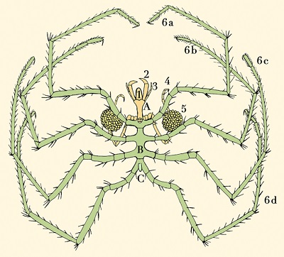Esquema de la anatomía de un picnogónido. (A) Cefalón, (B) Tronco, (C) Abdomen, (1) Probóscide, (2) Quelíforos, (3) Pedipalpos, (4) Ovígeros, (5) Bolsas de huevos, (6) Patas locomotoras. Fuente: Sars, G. O. (1895).L. Fdez (LP) – digitization and colouration. CC BY-SA 2.1 es, Wikimedia Commons