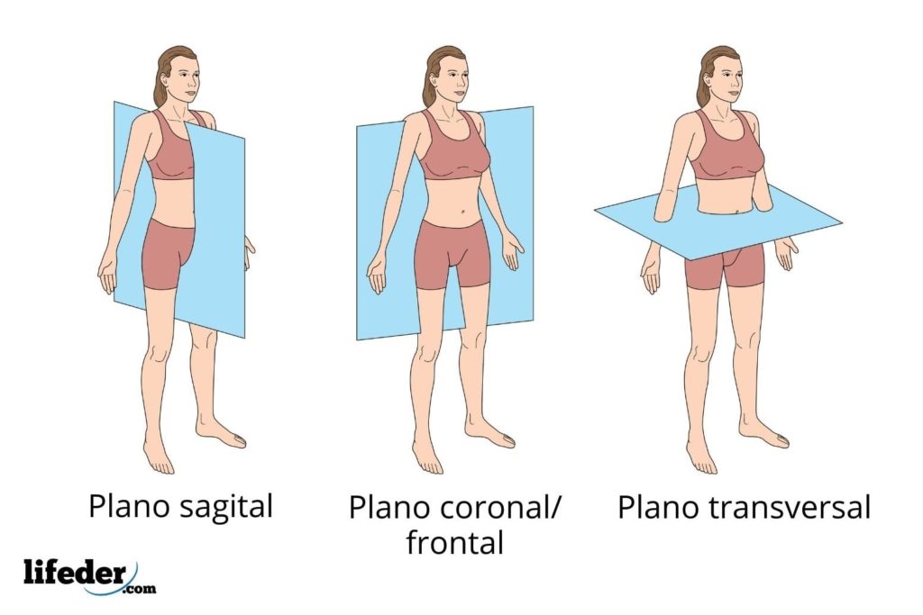 El plano sagital divide al cuerpo a lo largo y horizontalmente en dos mitades, una derecha y una izquierda; el plano coronal lo divide en una porción delantera y otra trasera, y el plano transversal, finalmente, divide el cuerpo horizontalmente en dos mitades: una superior y una inferior.