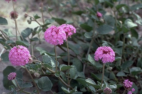 La verbena del desierto es una planta pequeña con abundantes vellosidades, de crecimiento rastrero. Sus hojas son ovaladas y verdes. Los pedúnculos tienen inflorescencias redondeadas de color magenta luminoso o de un tono púrpura rosa. Las flores tienen un aroma dulce.