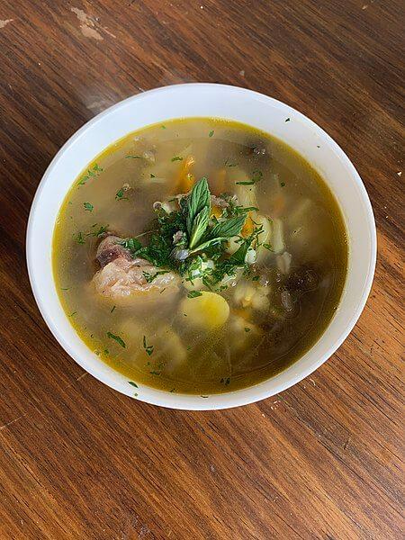 Se le agrega puré de chuño y especias. Se sirve en plato hondo y se acompaña con habas tostadas.