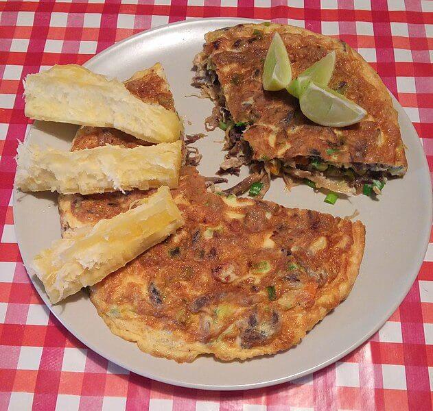 Este plato se compone de una tortilla de cebolla, ají molido, harina de trigo, algas marina y el elemento que le da el nombre: el pez raya. Este se añade a la tortilla una vez que está seco, salado y deshilachado. Esta receta se suele acompañar con yuca sancochada o choclo.