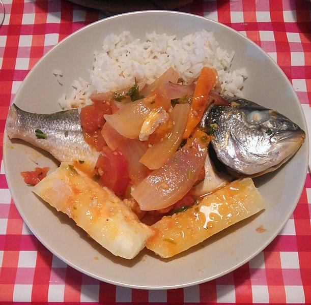 Suele ir acompañado con yucas, cebollas y frijoles negros preparados con ají y ajonjolí.