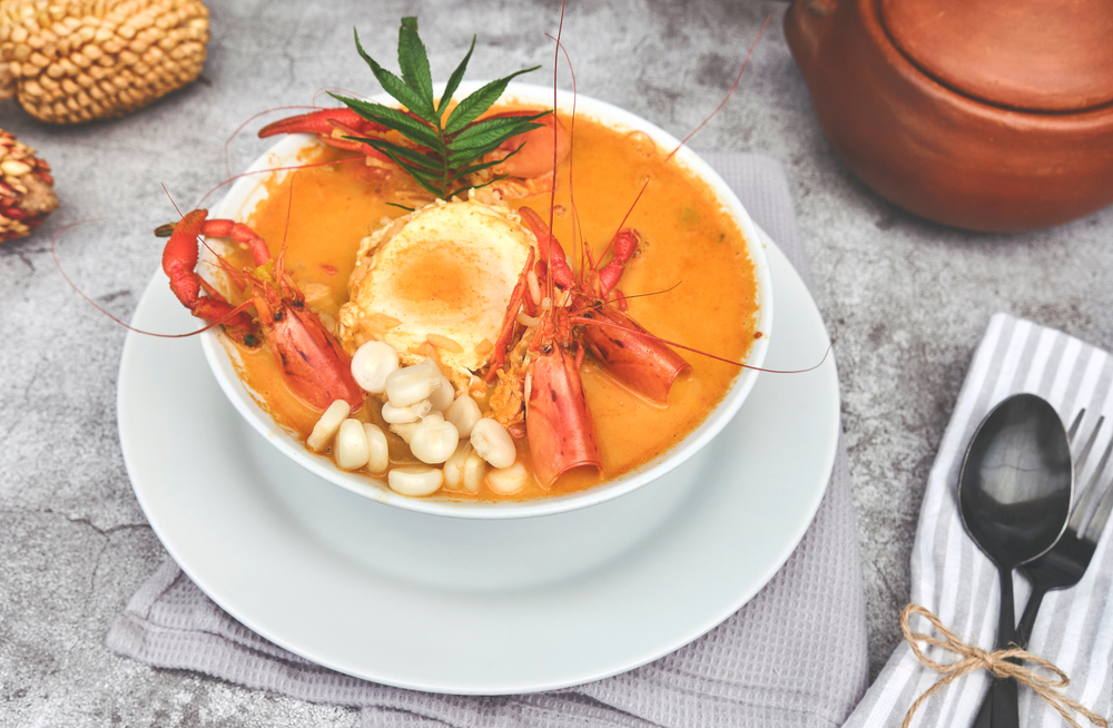 El chupe es una sopa tradicional peruana y en esta variación se utilizan camarones como elemento principal, papa amarilla, arvejas y ajíes.