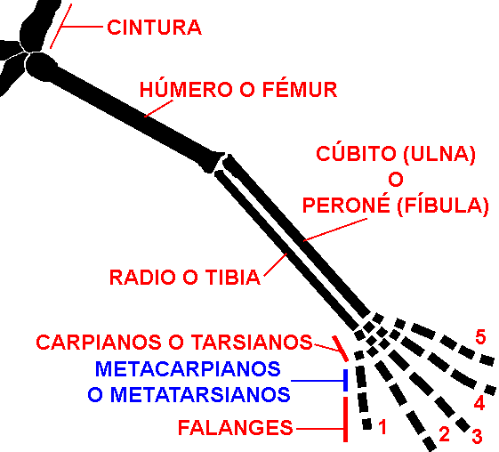 La mayoría de las extremidades de mamíferos muestran la morfología plesiomórfica de cinco huesos metacarpianos y los “dedos” con un máximo de tres falanges cada uno.