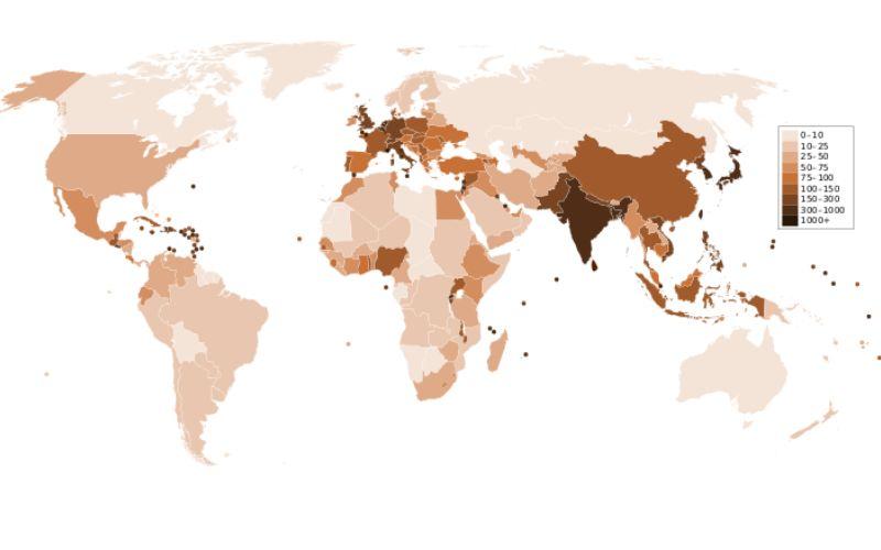China tiene más de 1.412.360 habitantes, podría pensarse que tiene una altísima densidad de población, pero no es tanta, debido a su extensísima superficie territorial (es el tercer país más grande del mundo).