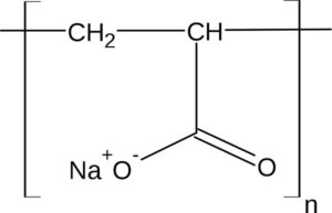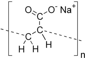 - Como absorbente en varias aplicaciones. Se usa como superabsorbente en varios productos de amplio consumo. Un gramo de este polímero puede absorber de 300 a 1.000 gramos de agua pura. Por ejemplo, se emplea en pañales desechables, en servilletas sanitarias, almohadillas de lactancia materna y otros artículos de uso doméstico. En estos casos, absorbe eficientemente los fluidos acuosos corporales, como orina o sangre. Se usa también para prevenir derrames de líquidos mediante su solidificación. Permite lidiar con fluidos corporales atrapándolos en un gel semisólido y seco, haciendo que su disposición sea más fácil. En hospitales y clínicas, sirve para el manejo de derrames y en botellas para succión de fluidos. Esto permite ahorros en lavandería, menos vergüenza para los pacientes y reducir resbalones y ajetreo para los profesionales de la salud que los atienden.
