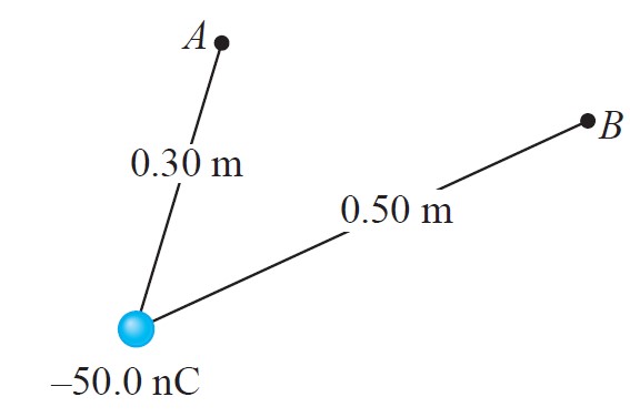 Una carga Q = − 50.0 nC se localiza a 0.30 m del punto A y a 0.50 m del punto B, tal como se muestra en la figura siguiente. Responder las siguientes preguntas: