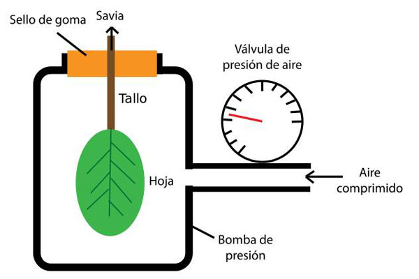 Luego se procede a aumentar la presión dentro de la cámara introduciendo un gas presurizado, midiendo mediante manómetro la presión que se va alcanzando. La presión del gas sobre la hoja va en aumento, hasta el punto en que el agua contenida en esta brota por el tejido vascular del pecíolo.
