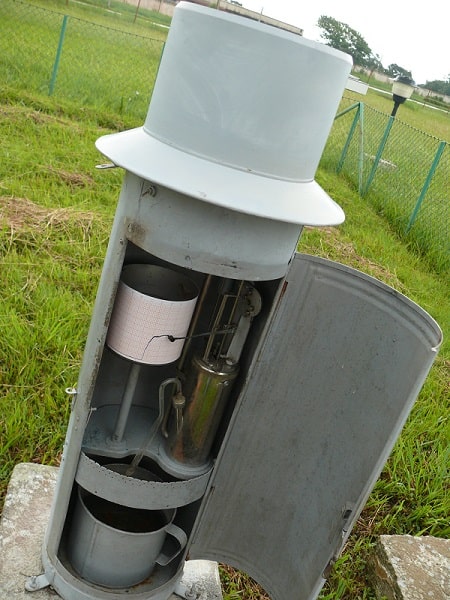 Este aparato es usado en las estaciones meteorológicas para medir precipitación, tanto pluvial como de nieve. Consiste en un recipiente con una abertura superior de área conocida y un depósito inferior.