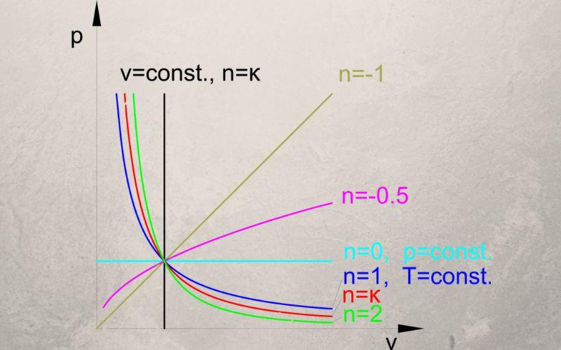 – Los procesos adiabáticos (a entropía S constante), en los cuales el exponente es n=γ, siendo γ la constante adiabática. Esta constante es el cociente entre la capacidad calorífica a presión constante Cp dividido entre la capacidad calorífica a volumen constante Cv: