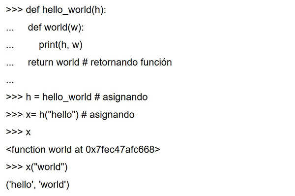 Se pueden asignar a variables y retornarlas. Por ejemplo, en el siguiente código se puede asignar la función hello_world, ejecutando luego la variable como una función.