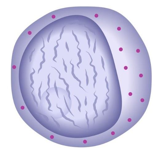 - Núcleo. Poseen un núcleo redondo o semi-ovalado que se tiñe de un color azul-rojizo y donde se puede apreciar una trama cromatínica delicada con uno o dos nucléolos. En este estadio se observa el comienzo de la formación de las indentaciones de la envuelta nuclear característica de los granulocitos.