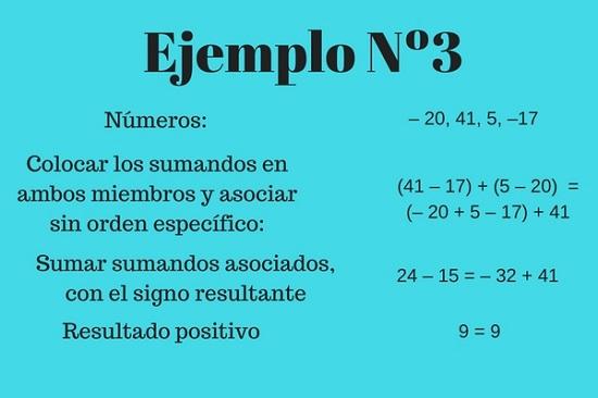 Se aplica cuando hay 3 o más sumandos, los cuales pueden asociarse de diferente manera, pero el resultado debe dar igual en ambos miembros de la igualdad. También se le denomina asociatividad.