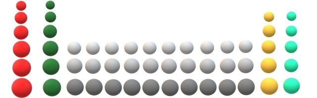 De esta manera, las supuestas esferas adquirirían colores que permitirían diferenciarlas unas de otras en grupos. Conociendo sus características electrónicas, se podrían organizar en períodos, y los grupos delatarían aquellos que poseen el mismo número de electrones de valencia.