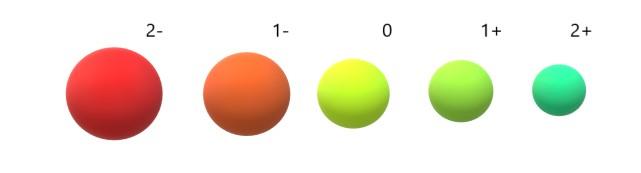 Se aprecia que el anión 2- es el más voluminoso de todos, y el catión 2+ el más pequeño. Los radios aumentan cuando el átomo se carga negativamente, y se contrae cuando se carga positivamente.