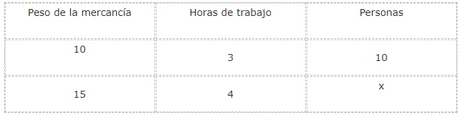 Para este caso, el peso representa una variable de relación directa con la incógnita tiempo. Por otra parte la variable trabajadores maneja una relación inversa con el tiempo. A mayor número de trabajadores, la jornada será más breve.