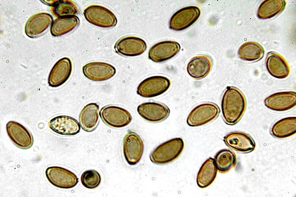 – Basidios. Producen cuatro esporas de color púrpura a marrón y de forma oblonga, con dimensiones de 10,5 a 15 por 6,5 a 8,5 μm.