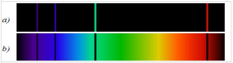 La línea espectral de emisión es opuesta al espectro continuo de la luz blanca. En la primera, la distribución espectral se observa en forma de líneas brillantes y en la segunda se observa una banda continua de colores.