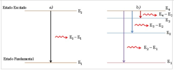 En el estado excitado, el tiempo de permanencia del electrón es muy pequeño (≈ 10-8 s), el átomo es inestable y regresa al estado fundamental, pasando, si es el caso, por niveles intermedios de energía.