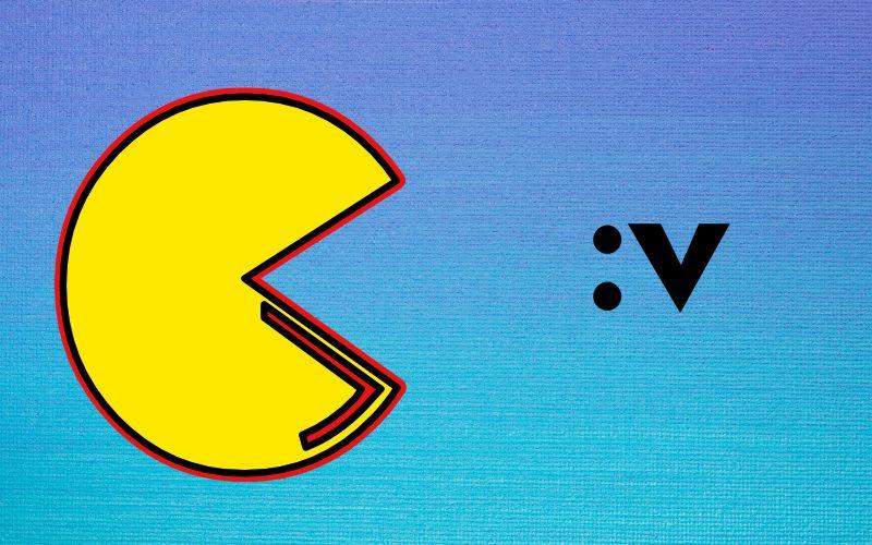 El emoticono :v surgió en la red social Facebook y se emplea como si fuese Pac-Man, el protagonista del videojuego arcade homónimo, en el que una bolita amarilla con boca se come los puntos que hay en un laberinto.