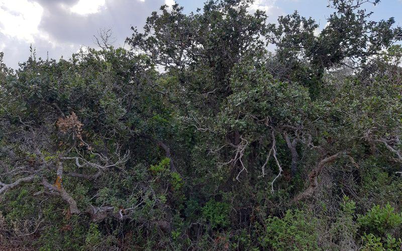 – Apariencia. Planta arbustiva perennifolia de 2-3 m que puede convertirse en un pequeño árbol de 4-6 m. Sus amplias ramificaciones de corteza lisa y grisácea se entretejen desde la base del tallo creando un follaje tupido e impenetrable.