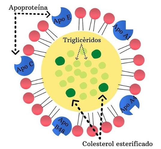 Los quilomicrones son considerados lipoproteínas compuestas por una proteína particular: la apolipoproteína B-48, a la cual se unen ácidos grasos esterificados a una molécula de glicerol (triacilgliceroles o triglicéridos) y otros lípidos o sustancias tipo lípido.