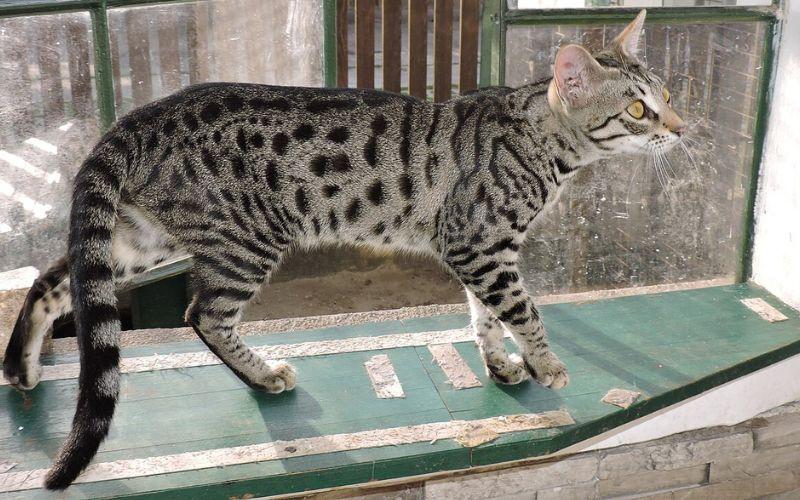 Se originó en Egipto. De hecho, nació del cruce entre gatos domésticos y salvajes. Su figura es estilizada, esbelta y musculosa. Sus ojos son grandes y ovalados, con un tono verde amarillento. Su pelaje es corto y denso, de color que va del negro o plateado, al pardo atigrado.