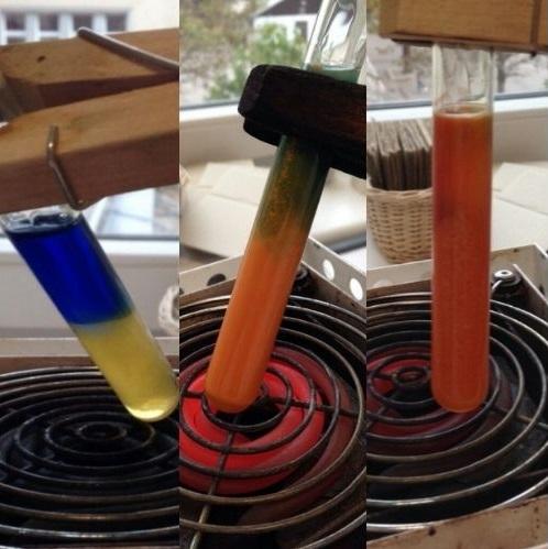 En la imagen superior se muestra el reactivo de Fehling en el tubo de ensayo de la izquierda. Su color azulado se debe al CuSO4·5H2O disuelto en agua, cuyos iones de cobre se acomplejan con los aniones tartratos, evitando que precipite el hidróxido de cobre en medio alcalino.