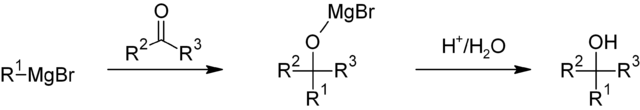 La principal aplicación sintética del reactivo de Grignard es su reacción con compuestos que tienen grupos carbonilos para la producción de alcoholes. La formación de enlaces carbono-carbono es rápida y exotérmica cuando el reactivo de Grignard reacciona con un aldehído o una cetona.