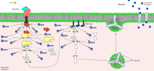 La insulina sintetizada y liberada por el páncreas se une a su receptor en la membrana plasmática de las células blanco, y como consecuencia de esta unión ligando-receptor se desencadena una serie de procesos intracelulares que finalmente promueven el ingreso de glucosa a dichas células.