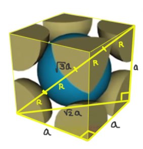 Se forman dos triángulos rectángulos, uno de hipotenusa √2a y el otro de hipotenusa √3a, como puede demostrarse mediante el uso del teorema de Pitágoras. De allí se tiene que la relación entre el parámetro de red y el radio atómico para una red cúbica I (centrada en el cuerpo) es:
