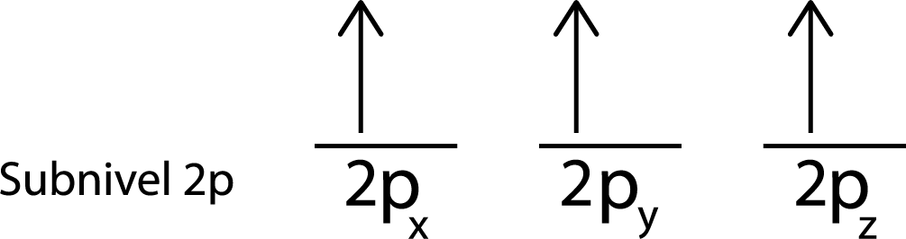 Como se trata del subnivel 2p, existen tres orbitales que son el 2px, 2py y el 2pz. Entonces, debemos dibujar tres rayas horizontales o tres cajitas o rectángulos: