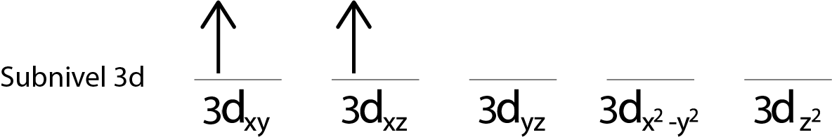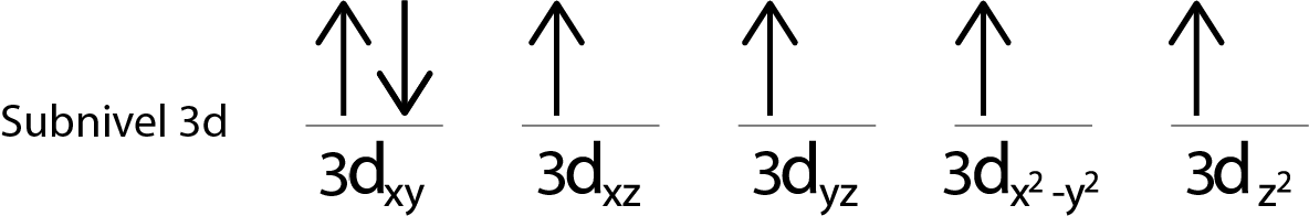 Como aún nos queda un electrón por repartir luego de colocar un electrón en cada orbital 3d, el último de los 6 electrones se coloca con el espín opuesto en el primer orbital.