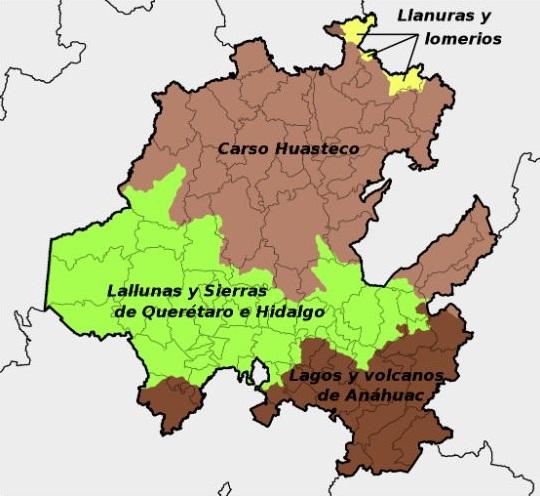 - Llanuras y Sierras de Querétaro e Hidalgo. En esta subprovincia se encuentran regiones como las del valle de Mezquital y la Comarca Minera.