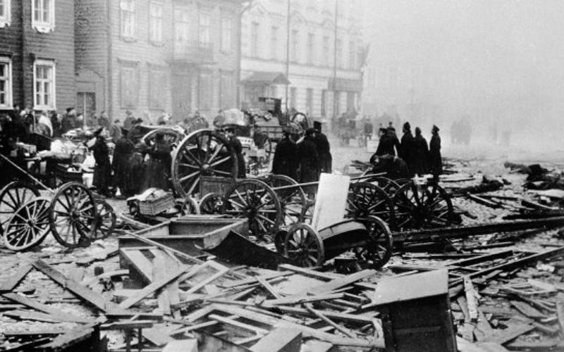 - Extensión de las protestas. Después de la matanza del Domingo sangriento, las protestas se extendieran por todo el país. Sin embargo, no había coordinación entre ellas, ya que cada grupo tenía sus propias reivindicaciones. Los campesinos, por ejemplo, se movilizaron por causas principalmente económicas. Los obreros compartían parte de esa motivación, pero también había un fuerte componente de oposición a cómo se estaba desarrollando la industria. Otros sectores, como los liberales, buscaban más derechos para los ciudadanos. Por último, también participaron miembros de varias etnias del imperio, que reclamaban más libertad y respeto para sus culturas. Todo el año, las manifestaciones y huelgas se sucedieron. En ocasiones, como en algunas zonas rurales, se produjeron actos de violencia. Así, los campesinos de Curlandia y Livonia quemaron un gran número de fincas de la nobleza.