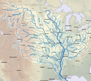 – Cuenca hidrográfica. Tiene una de las cuencas hidrográficas más grandes del mundo, cubriendo aproximadamente 3.2 millones de kilómetros cuadrados, lo que incluye partes de 31 estados de EE.UU. y dos provincias canadienses.
