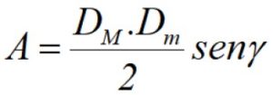 Finalmente, si conocemos las diagonales DM y Dm, más el ángulo γ entre ellas (ver figura 3), el área se puede calcular mediante el semiproducto de las diagonales por el seno de dicho ángulo: