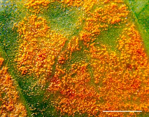 – Tamaño. Las urediniosporas de esta especie poseen un tamaño de 28-36 x 18-28 µm y paredes de 1 µm de espesor.