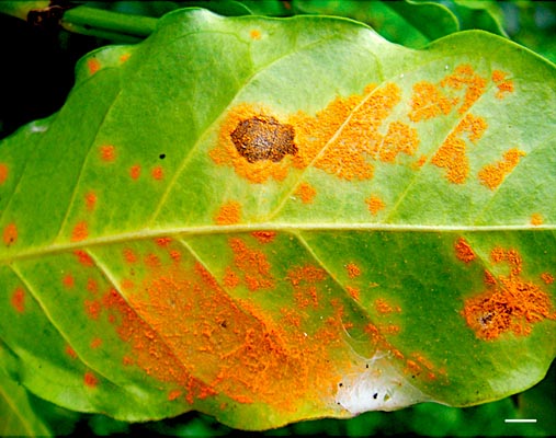 – Urediniosporas. Hemileia vastatrix posee urediniosporas reniformes. Las urediniosporas son esporas de paredes delgadas producidas por el uredo, una fase en el ciclo de vida de las royas.