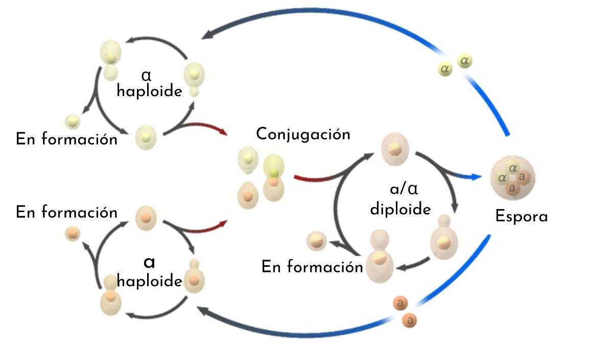 Las células diploides que crecen sin nitrógeno y sin fuente de carbono, sufren un proceso de meiosis, produciendo cuatro esporas (ascas). Estas esporas tienen alta resistencia y pueden germinar en un medio rico.