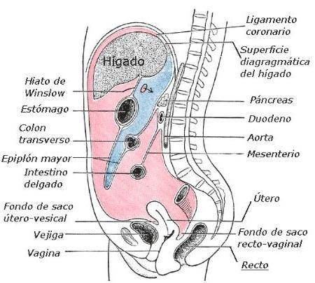 El peritoneo baja de la pared abdominal anterior hacia la superficie superior de la vejiga urinaria. Luego se desplaza directamente sobre la superficie anterior del útero.