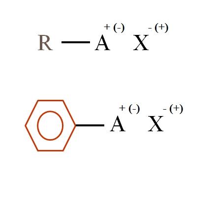 En la imagen superior se muestran dos fórmulas químicas muy generales para las sales orgánicas. La primera de ellas, R-AX, se interpreta como un compuesto en cuya estructura carbonada un átomo, o grupo A, porta una carga positiva + o negativa (-).