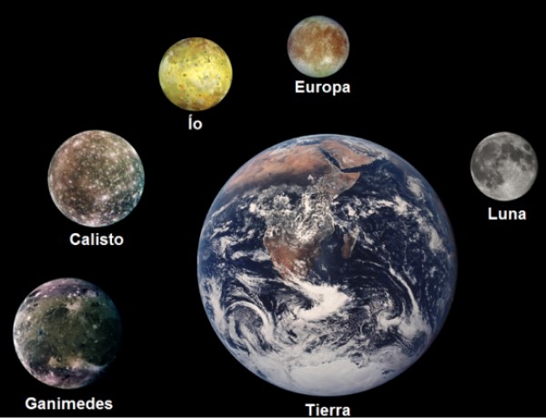 Uno de ellos, Io, posee atmósfera, efectúa una revolución completa alrededor de Júpiter en poco menos de 2 días y tiene una densidad media semejante a la de la Luna.