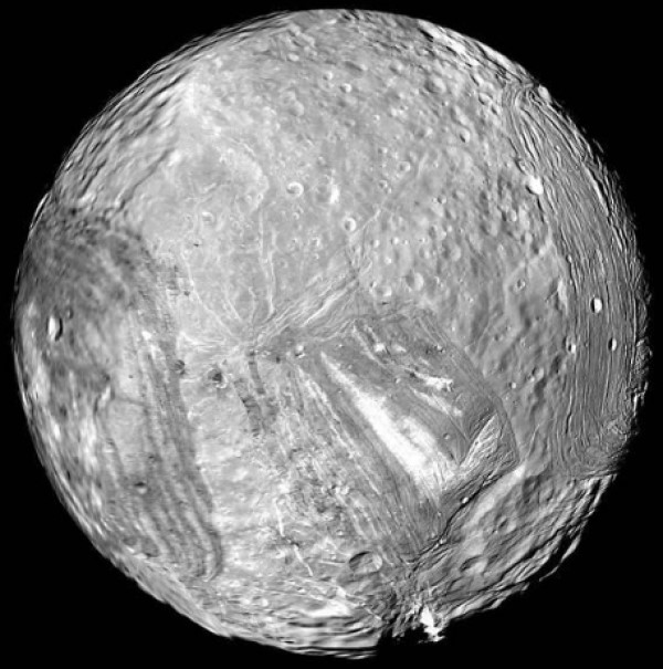 También es posible que se haya visto muy afectado por las fuerzas de marea causadas por el planeta padre Urano y por eso tenga ese inquietante aspecto resquebrajado.