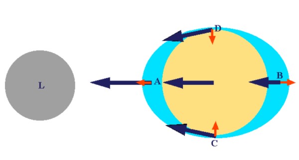 Pero la cosa cambia si se toma en cuenta un punto de la Tierra situado a cierta distancia del centro. Por ejemplo en la siguiente figura, la atracción gravitatoria de la luna (a la izquierda) es ligeramente diferente en los puntos A, B, C y D. Al menos esperamos que sea más intensa en el punto A, que está más cercano, y menor en el punto B, que se encuentra más alejado.