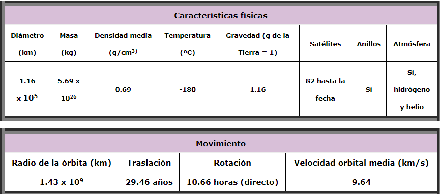 Los siguientes datos describen someramente el movimiento de Saturno: